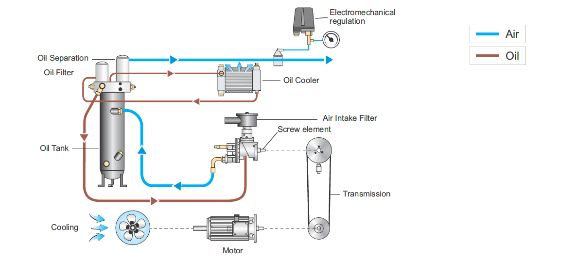 Piston Compressors For intermittent use High content of residual oil and humidity Alternating and pulsating High 70 - 75% of the intake air From 61 to 65 dB(A) Thermal circuit breaker